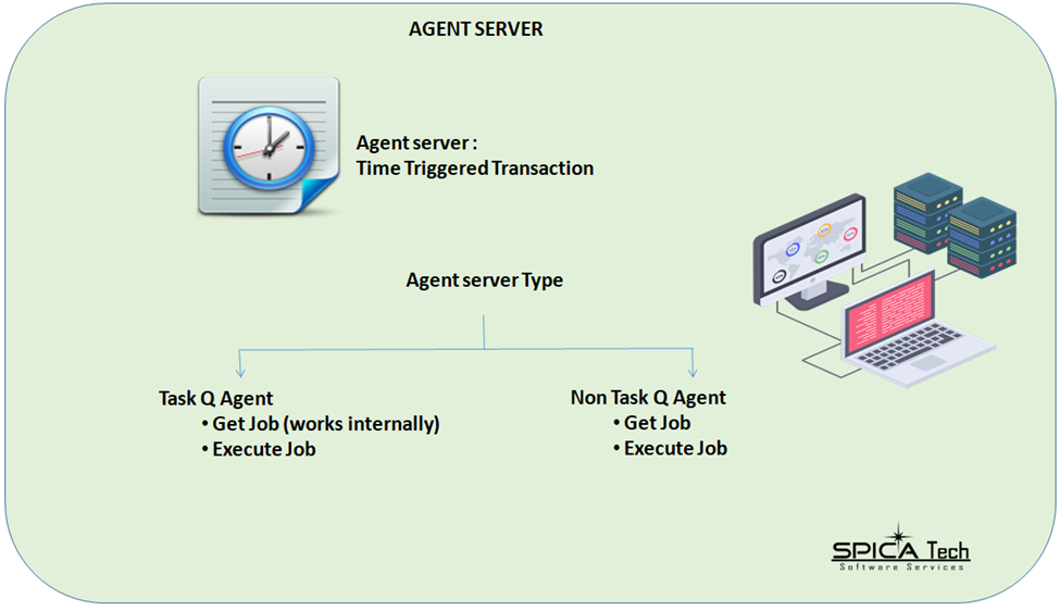 Agent Server is Time Triggered Transaction. Agent has two methods which is GetJob and Execute Job. Get Job will collect all Pending Jobs. Execute Job will process the pending tasks that has provided. Based on the customization of Agent has two types.