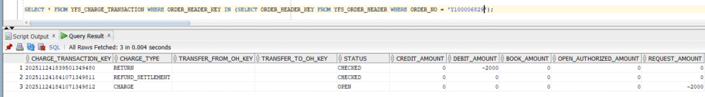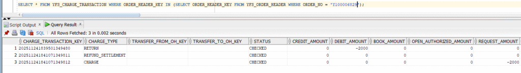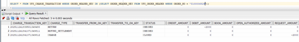 When the Request Collection Agent runs, it creates a Charge Entry in the YFS_Charge_Transaction table. A REFUND_SETTLEMENT record in the YFS_Charge_Transaction table indicates that the refund amount has been settled.