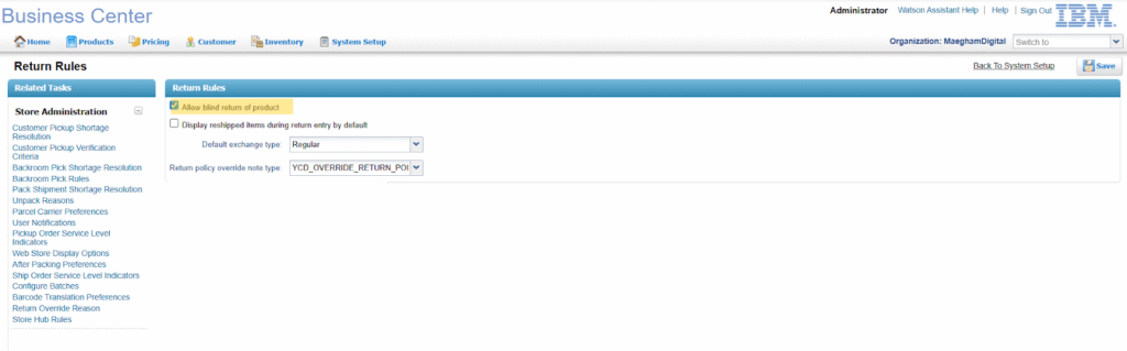 To allow blind return order creation in the IBM Sterling Store application, enable this check box in Sterling Business Center.
