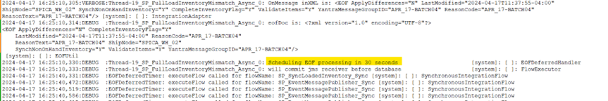 Once all item inventory information has been sent, an EOF message is dropped into the Queue with the same YantraMessageGroupID. When the integration server fetches the EOF message, it waits for a specified time (default is 5 minutes, but it is configurable). This wait time allows the OMS to assume that item inventory information for the one Ship Node is completely received when the YantraMessageGroupID of batches matches with the EOF message.