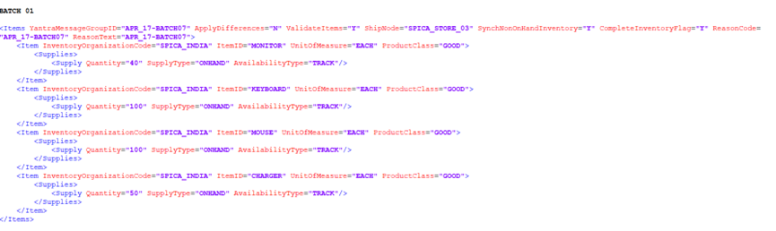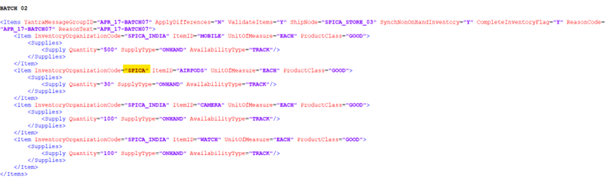 The SAP system drops the inventory information into the queue as batches, with each batch containing a unique YantraMessageGroupID. When updating multiple batches for a single ship node, the same YantraMessageGroupID must be maintained across all batches.
