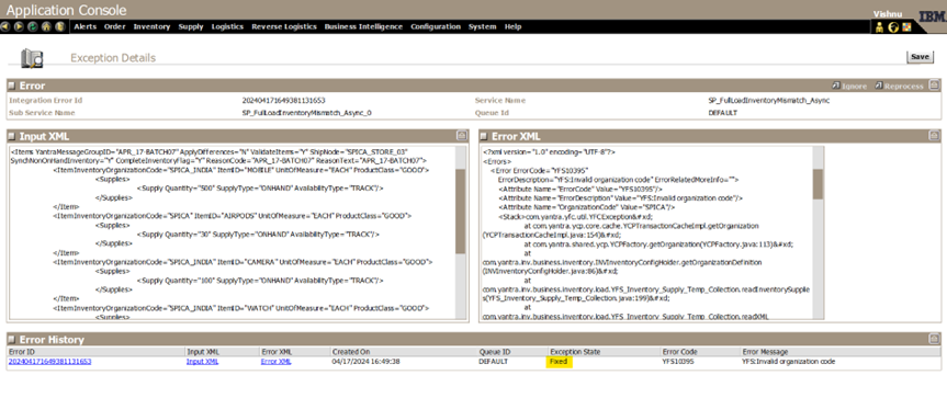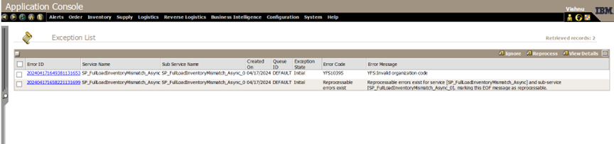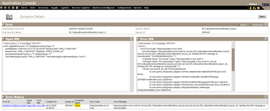 If there are any pending exceptions, the EOF message will be errored out as a ‘Reprocessable errors exist’ message in the YFS_REPROCESS_ERROR table. This ensures that the complete inventory information of the ship node is not updated in the OMS until the issues are resolved.