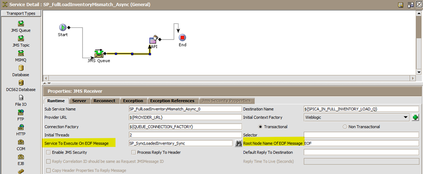 During the Inventory Load process, each ship node pushes the inventory picture of the products as a batch along with an EOF (End of File) message into the queue. After the Integration Server retrieves these messages from the queue, upon identifying the EOF message, it will initially look for any exceptions related to the same YantraMessageGroupID and service.