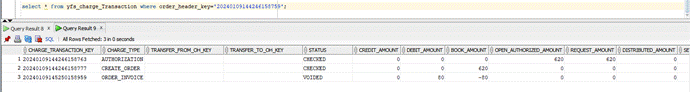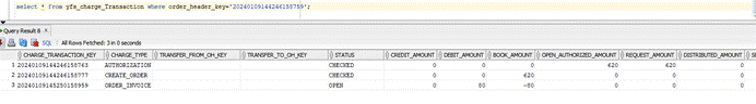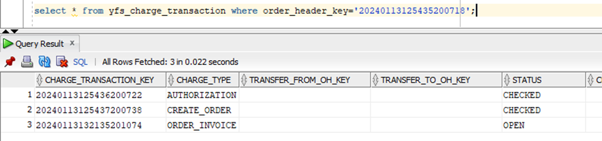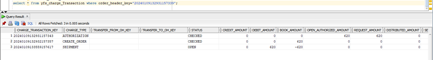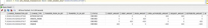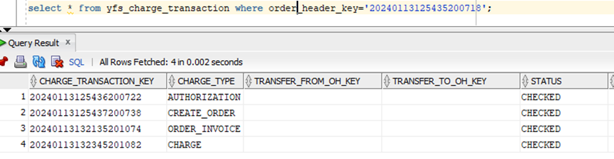 After calling the request and execute collection and check  YFS_CHARGE_TRANSACTION  table. Both ORDER_INVOICE and CHARGE status changed to “CHECKED”